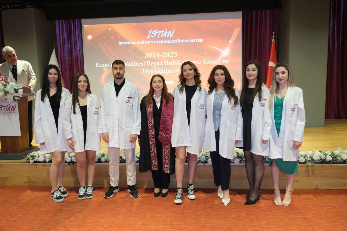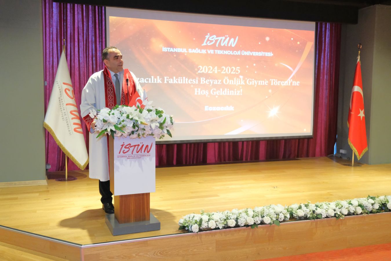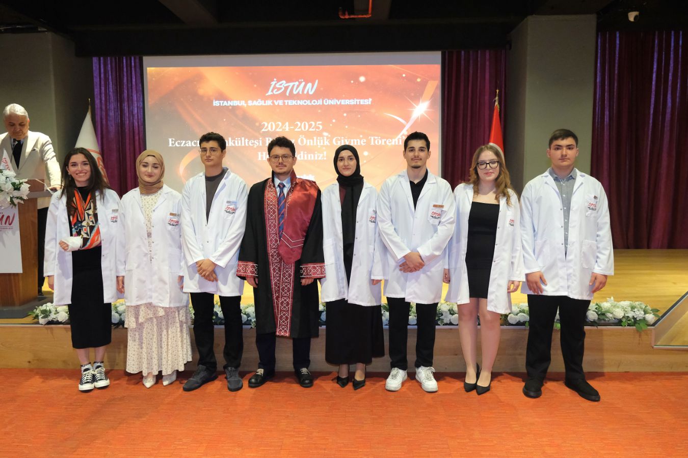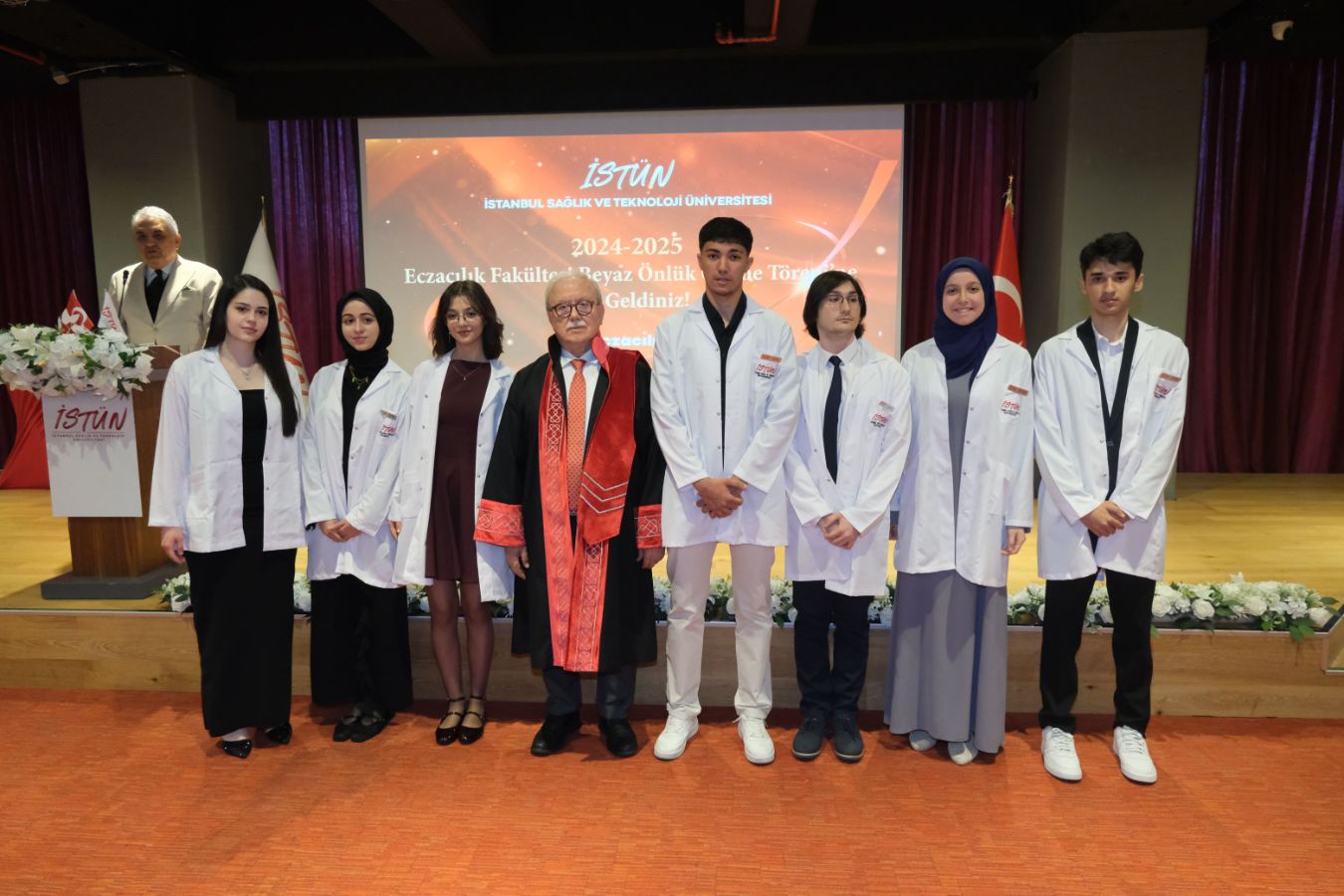 İstanbul Sağlık ve Teknoloji Üniversitesi (İSTÜN), 2024-2025 Akademik Yılı Eczacılık Fakültesi Türkçe ve İngilizce 1. sınıf öğrencileri için Beyaz Önlük Giyme Töreni 14 Mayıs Dünya Eczacılar Günü’nde gerçekleşti. Protokol katılımı, öğrencilerimizin ve ailelerinin yoğun ilgisi ile düzenlenen tören Sütlüce Kampüsü Oditoryumunda gerçekleşti. Törenin sunuculuğunu ise Tıp Fakültesi öğretim üyelerimizden Dr. Öğr. Üyesi Ömer Önder Önder üstlendi.