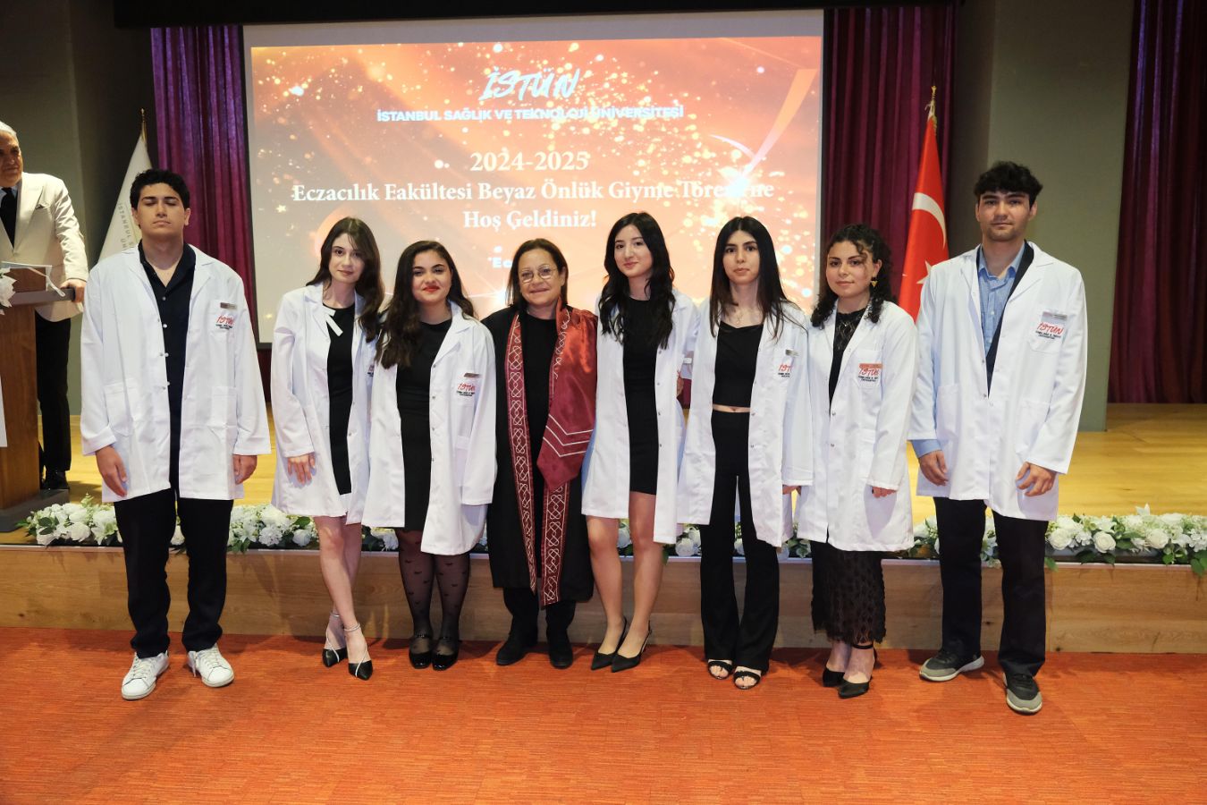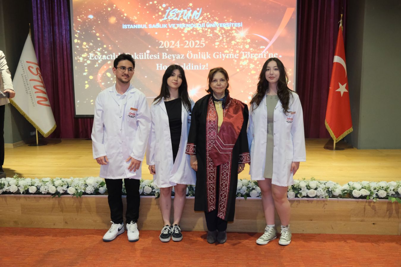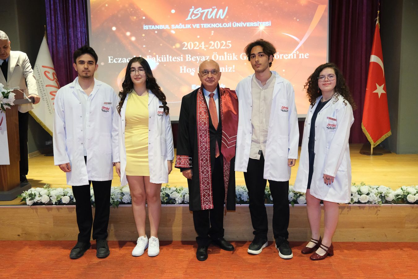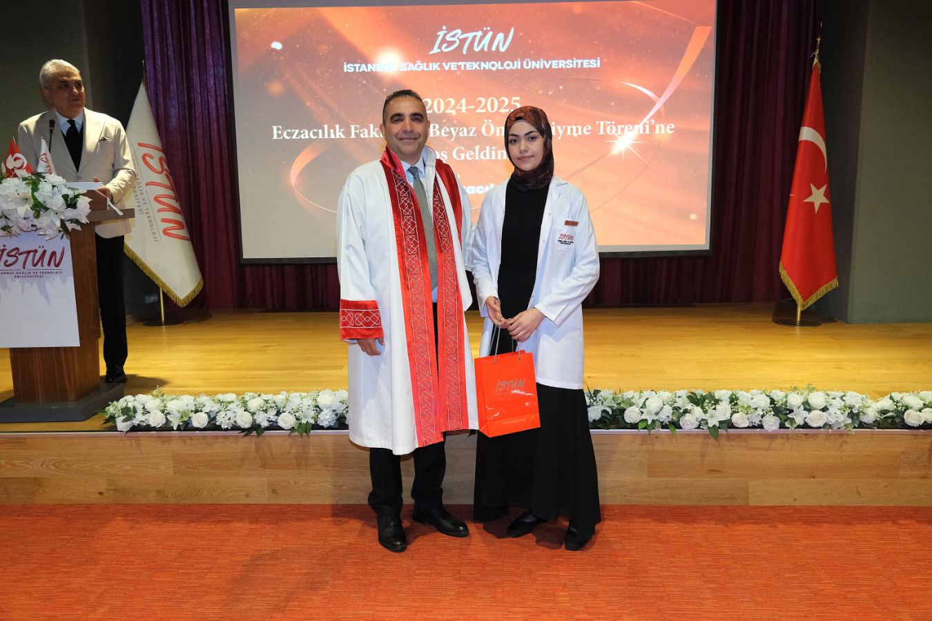 İstanbul Sağlık ve Teknoloji Üniversitesi (İSTÜN), 2024-2025 Akademik Yılı Eczacılık Fakültesi Türkçe ve İngilizce 1. sınıf öğrencileri için Beyaz Önlük Giyme Töreni 14 Mayıs Dünya Eczacılar Günü’nde gerçekleşti. Protokol katılımı, öğrencilerimizin ve ailelerinin yoğun ilgisi ile düzenlenen tören Sütlüce Kampüsü Oditoryumunda gerçekleşti. Törenin sunuculuğunu ise Tıp Fakültesi öğretim üyelerimizden Dr. Öğr. Üyesi Ömer Önder Önder üstlendi.