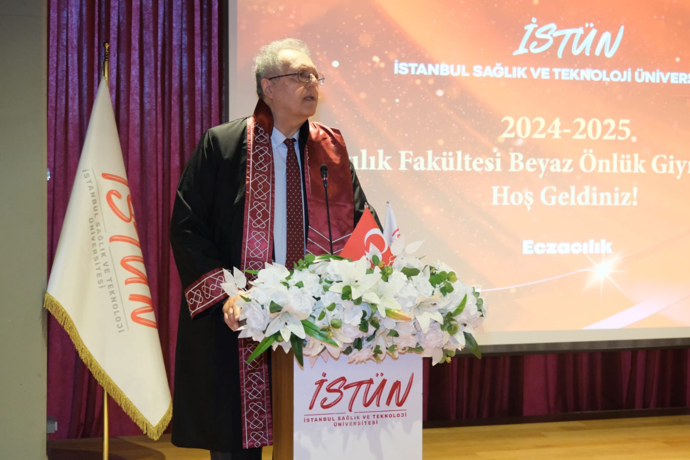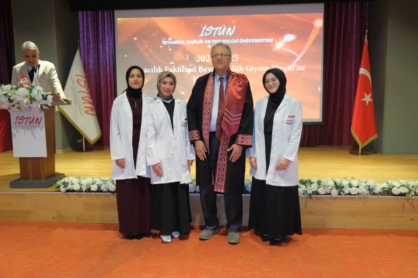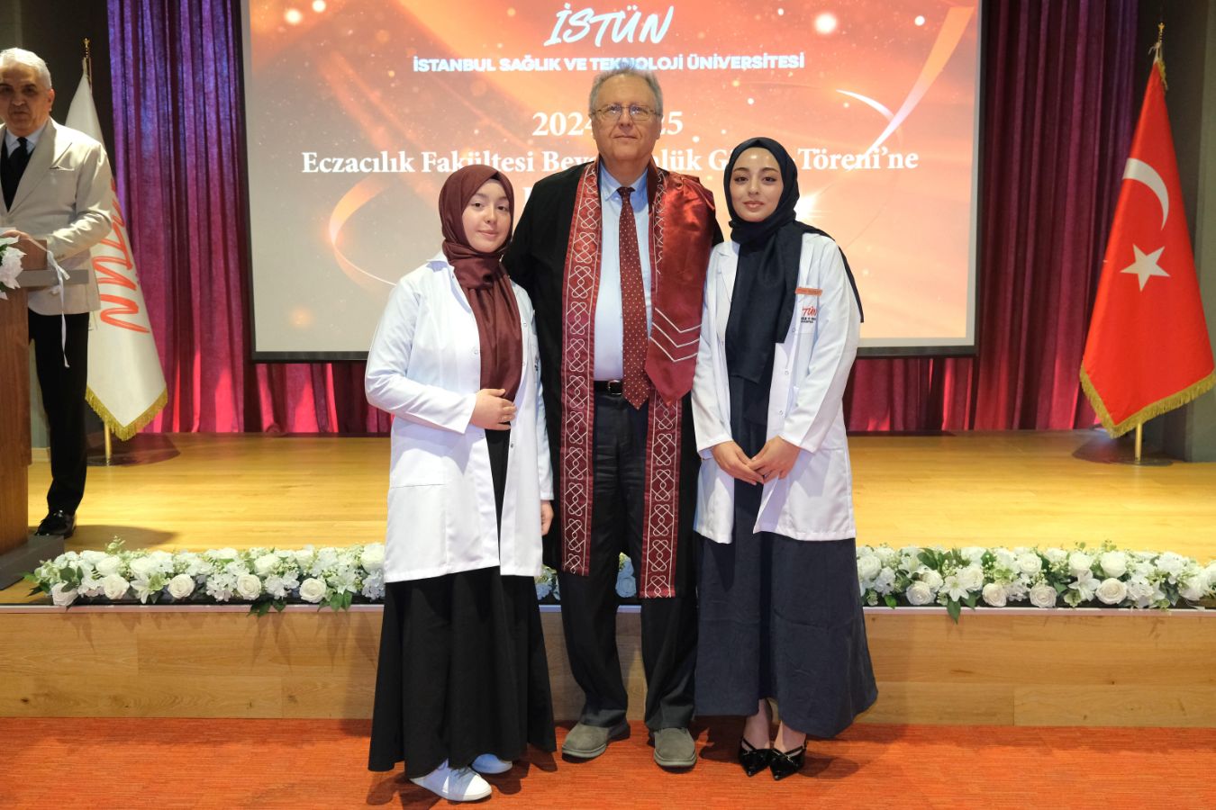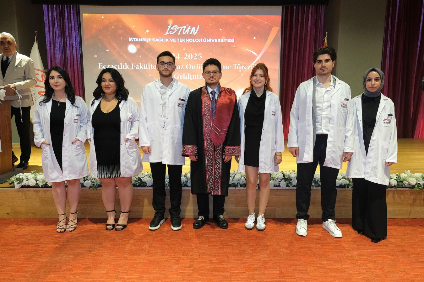 İstanbul Sağlık ve Teknoloji Üniversitesi (İSTÜN), 2024-2025 Akademik Yılı Eczacılık Fakültesi Türkçe ve İngilizce 1. sınıf öğrencileri için Beyaz Önlük Giyme Töreni 14 Mayıs Dünya Eczacılar Günü’nde gerçekleşti. Protokol katılımı, öğrencilerimizin ve ailelerinin yoğun ilgisi ile düzenlenen tören Sütlüce Kampüsü Oditoryumunda gerçekleşti. Törenin sunuculuğunu ise Tıp Fakültesi öğretim üyelerimizden Dr. Öğr. Üyesi Ömer Önder Önder üstlendi.