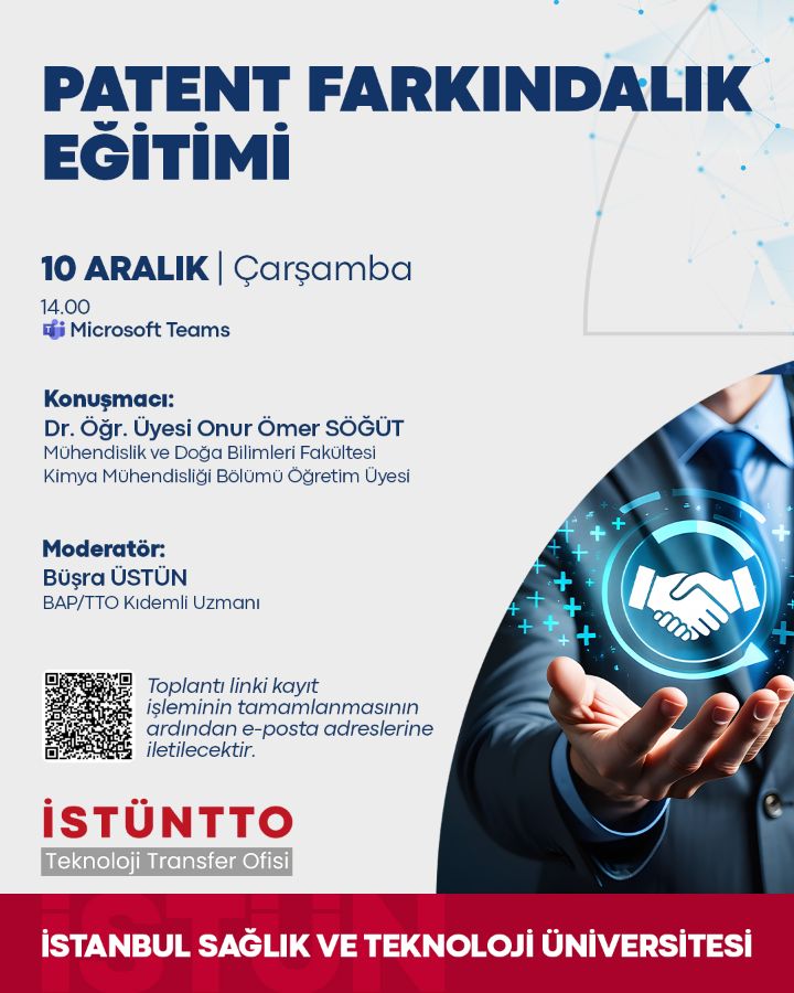 Patent Farkındalık Eğitimi etkinliği kapsamında toplantı linki kayıt işleminin tamamlanmasının ardından e-posta adreslerine iletilecektir. Kayıt linkine ulaşmak için tıklayınız.